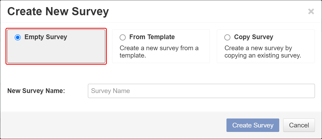 Empty Survey will take you to your familiar Survey Editor where you can set up a new survey as usual
