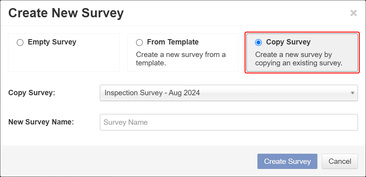 Copy Survey will give you the familiar dialogue for copying a survey in your account