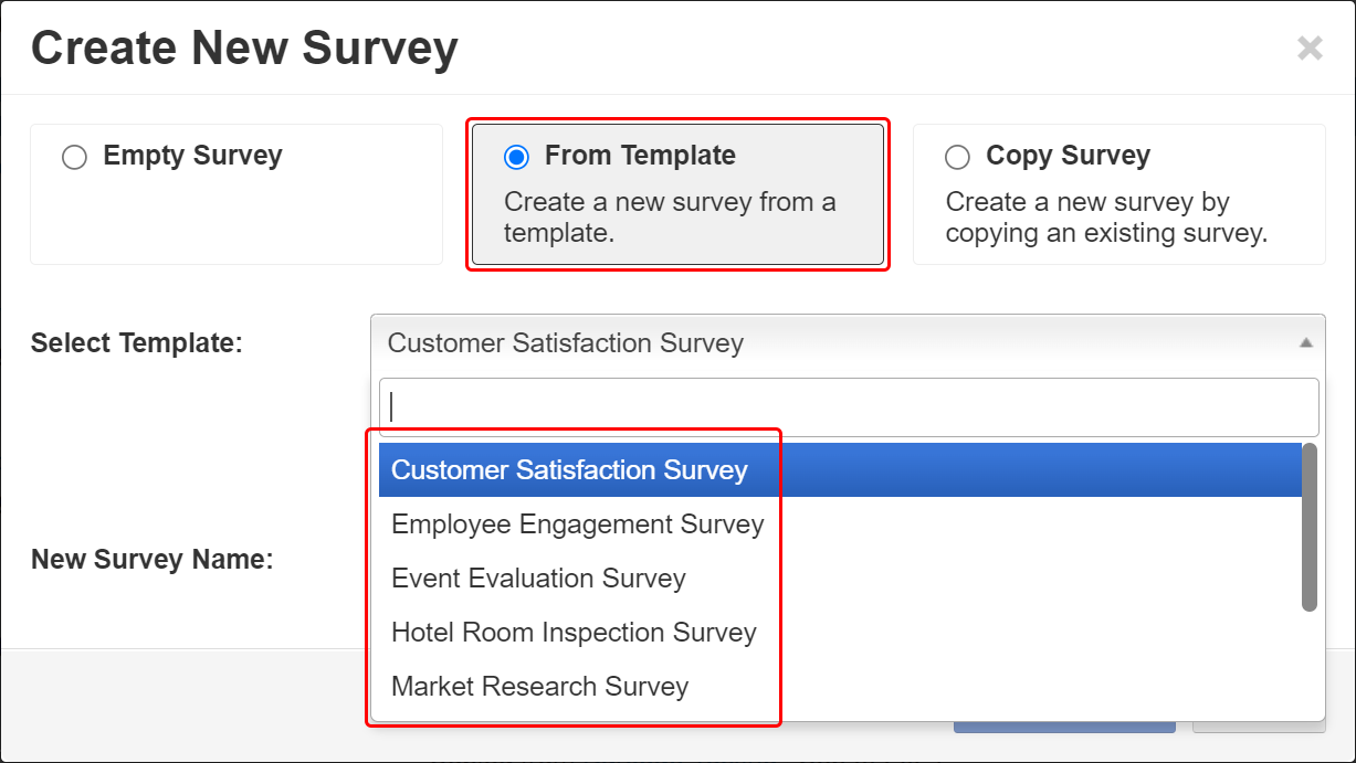 You will note that there is now a third way of creating new surveys: From Template which allows you to choose a template that we provide. You can then modify the template however you want.