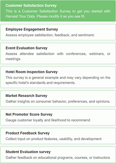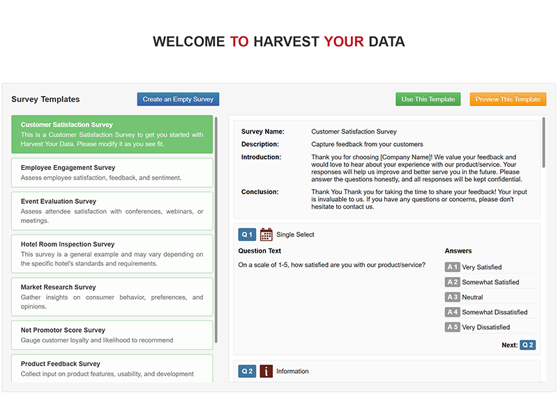 If you create a new account on Harvest Your Data you will also see a new Welcome page where these template surveys can be found.