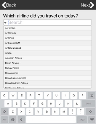 The respondent taps the drop down menu to display a list of options. They can then scroll through the entire list and tap one answer to select it.