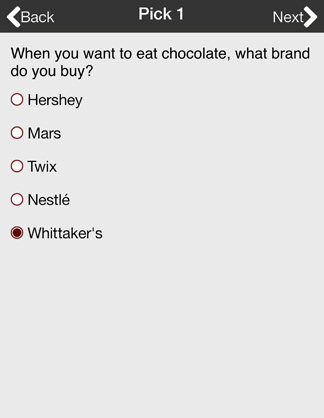 After enabling Auto Next, the respondent only needs to make one tap per single select question. The respondent taps the single select option and the user interface automatically proceeds to the next screen. There is a one second pause before the next screen is displayed to give the respondent time to see which option they have selected. If the respondent makes a mistake in their selection, they can easily click the back button to return to the previous question.